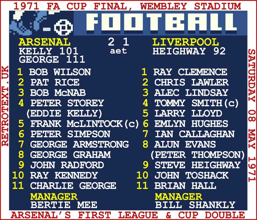 Arsenal had already secured the title with victory at arch rivals Tottenham and completed the double by beating Liverpool in the FA Cup Final a few days later, with the game being settled by three goals in extra-time – including the winner by Charlie George.
