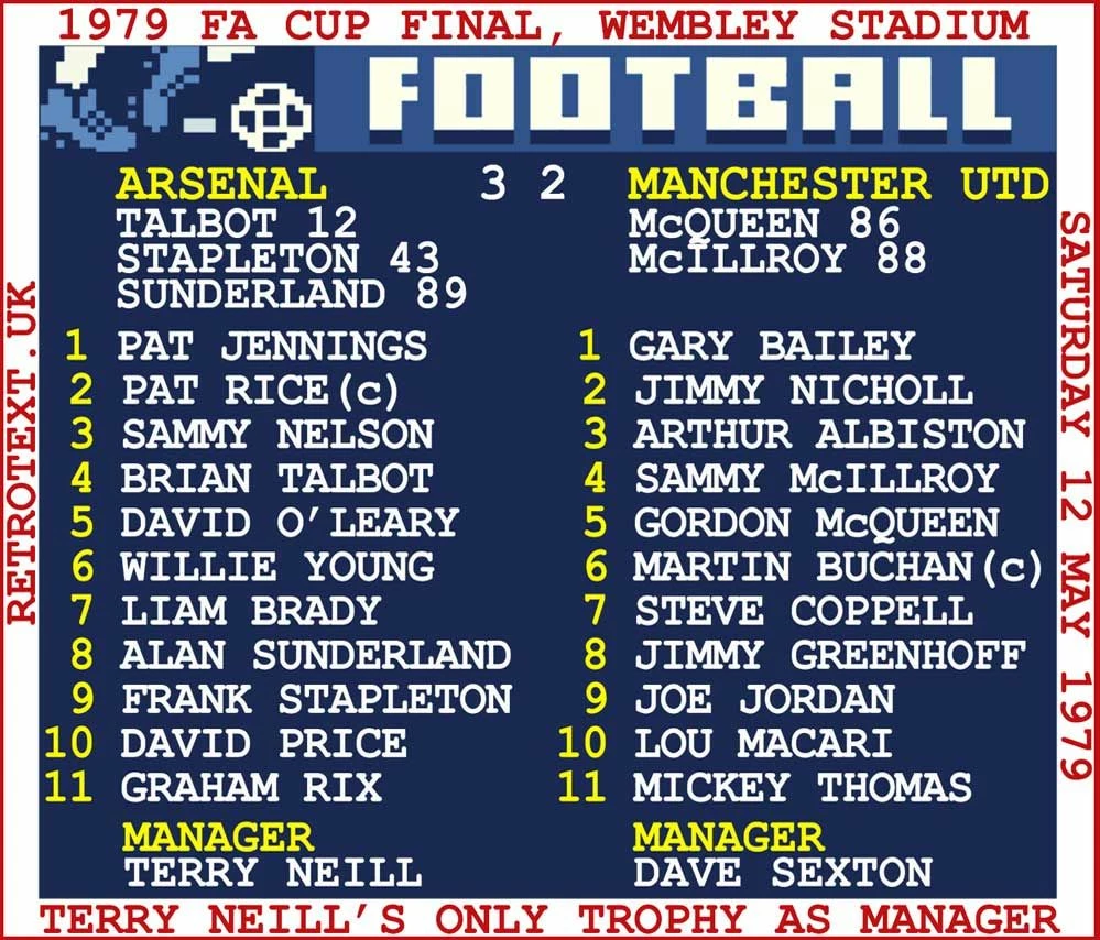 With Arsenal 2-0 up with five minutes left and seemingly coasting to victory, United scored twice in two minutes only for the Gunners to re-take the lead just a minute later courtesy of Alan Sunderland.