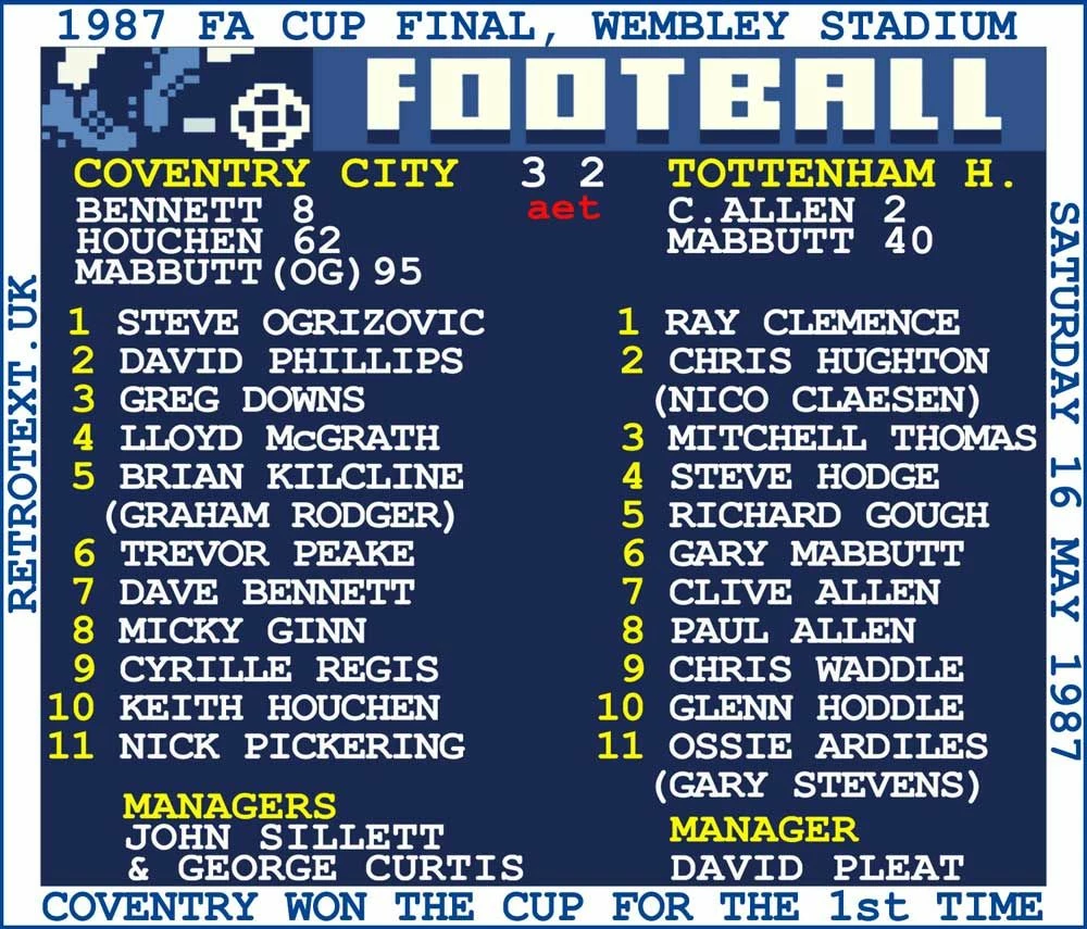 Probably the finest hour (or 120 minutes) in Coventry City’s history was the 1987 FA Cup Final in which the Sky Blues defeated Tottenham 3-2 after extra-time, a game which veteran broadcaster John Motson has described as the finest he commentated on.