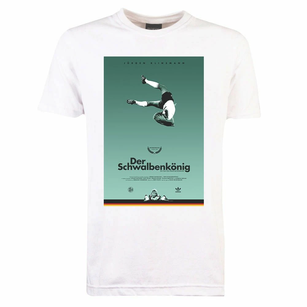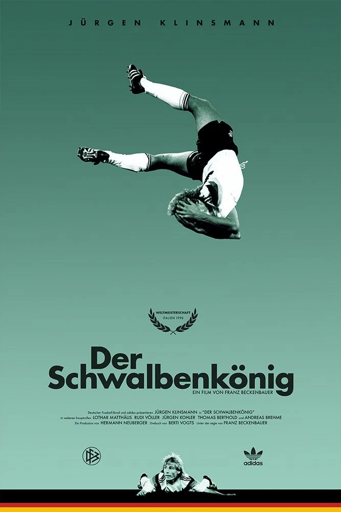 Print designed by talented artist James Campbell Taylor for his newest project ‘From Stadio to Studio’. The new designs reimagine famous moments from football history as movie posters. This print features German striker Jurgen Klinsmann, who was known for his diving celebrations after scoring a goal, which in German football is known as “Schwalbe” which translates in English to “Swallow”. Klinsmann helped Germany bring home the 1990 World Cup title.